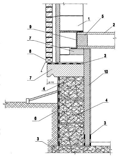 Опирание кладки на цоколь из бетонных фундаментных блоков с монолитным поясом и утеплением изнутри