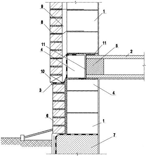 Опирание кладки на цоколь из монолитного железобетона и ячеистобетонных блоков. Перекрытие из сборных железобетонных плит.
