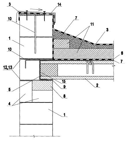 Примыкание плоской кровли к несущей наружной стене с парапетом